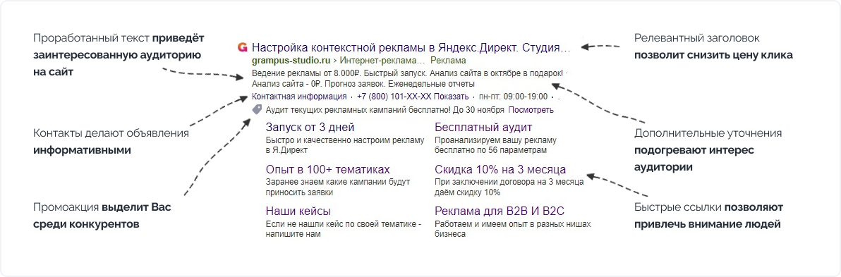 Заказывая у нас настройку рекламы в Яндекс Директ, вы получаете комплексную услугу: